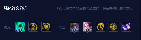 強化符文方面珠光蓮花(技能可暴擊)、組件百寶袋(裝備更容易成型)、飛升(15秒的神)、DD街區(qū)(追三星更容易)最優(yōu)。彩色符文黃金門票最優(yōu)。