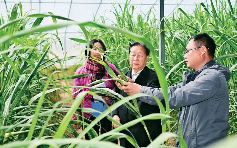 圖為2021年3月29日,林占熺(中)在寧夏銀川市永寧縣閩寧鎮(zhèn)農(nóng)戶劉昌富的大棚里查看菌草生長情況。 圖源:新華社