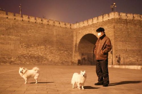 12月20日,北京。霧霾之中,燈光之下的明長(zhǎng)城遺址公園,佩戴口罩的市民和他的兩只小狗。澎湃新聞?dòng)浾?權(quán)義 圖
