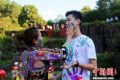 ­土家阿媽為游客抹上象征愛和幸福的彩色泥?!”R文偉 攝 ­第四屆湘西摸泥節(jié)22日在湘西古丈縣境內(nèi)的紅石林國(guó)家地質(zhì)公園內(nèi)開幕,上千名游客與土家族...