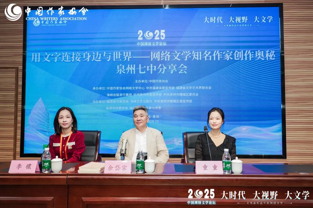 在泉州七中城南校區(qū)學(xué)術(shù)報(bào)告廳,福建師范大學(xué)文學(xué)院教授、博士生導(dǎo)師,福建省作家協(xié)會(huì)副主席余岱宗,中國(guó)作家協(xié)會(huì)會(huì)員、閱文集團(tuán)簽約作家李穠,中國(guó)作家協(xié)會(huì)會(huì)員童童登臺(tái)分享,與學(xué)子們展開(kāi)一場(chǎng)關(guān)于網(wǎng)絡(luò)文學(xué)創(chuàng)作與閱讀的深度對(duì)話。