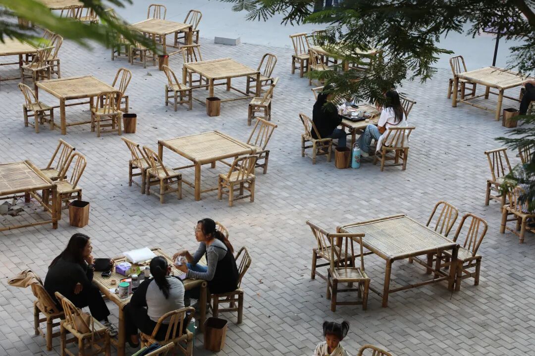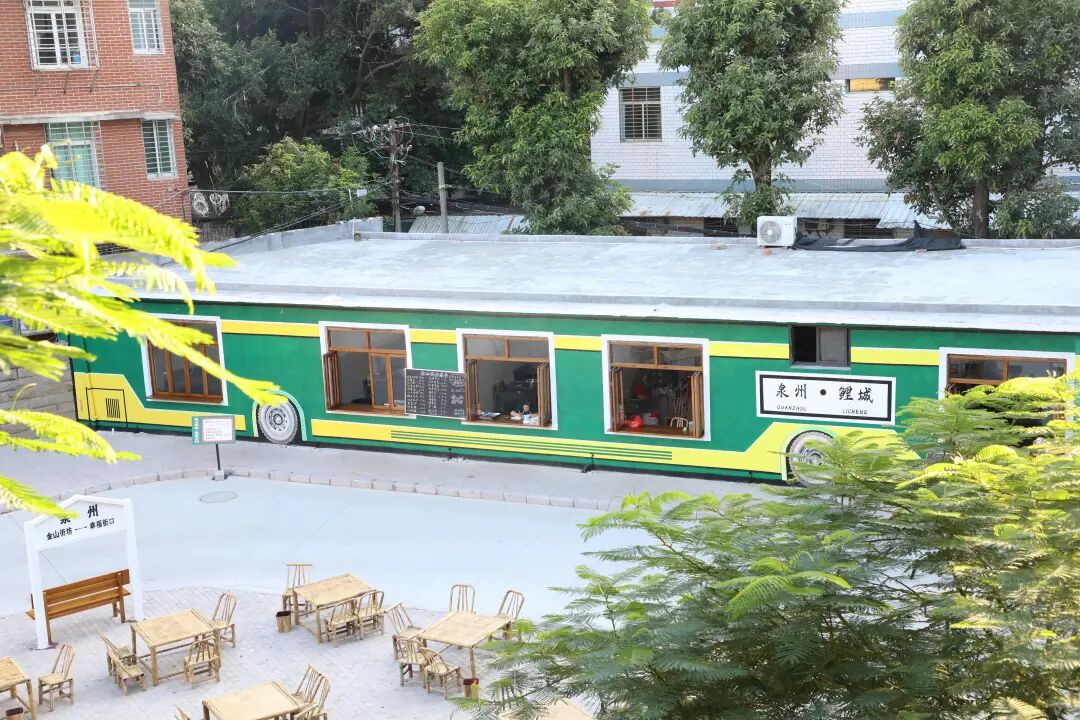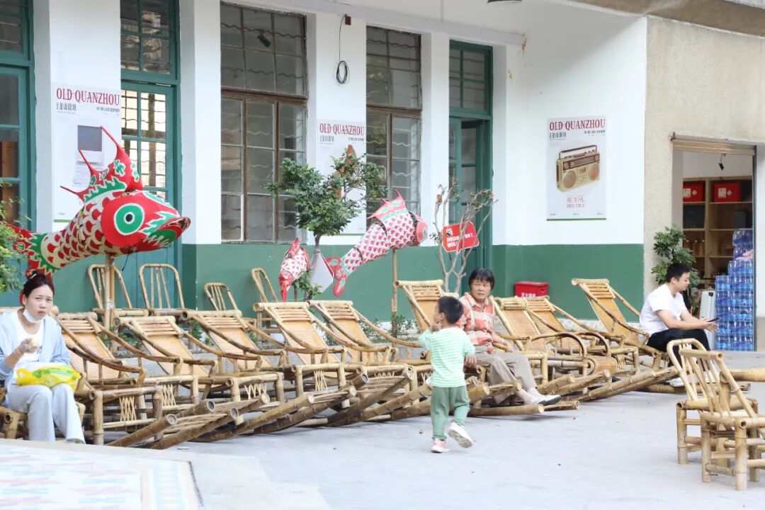 如今走進(jìn)金山街坊,仿佛一腳踏入時(shí)光隧道。開闊的大廣場上,幾十張竹桌竹凳整齊擺放,市民游客圍坐品茶,品嘗從“綠皮中巴車”造型餐車中端出來的古早味美食。榕樹下,孩子們追逐打鬧,笑聲陣陣;竹編搖椅上,居民閑話家常;復(fù)古路牌和小賣部等布景前,不少人忙著拍照留念,定格美好瞬間。室內(nèi)空間同樣精心規(guī)劃,一二樓打造為茶館和復(fù)古主題區(qū)域,三樓則被改造為多功能教室,定期開展非遺手工課等特色活動(dòng),實(shí)現(xiàn)了空間的高效復(fù)合利用。