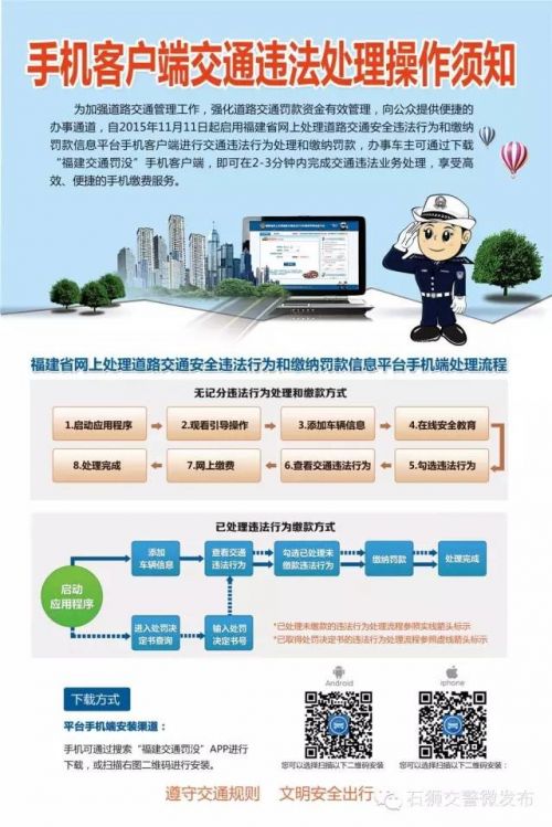 NO1:下載方法福建省網(wǎng)上處理道路交通安全違法行為和繳納信息平臺手機客戶端下載方式:1、Android版手機可到360手機市場搜索“福建交通罰沒”下載或掃描二維碼進行安裝;
