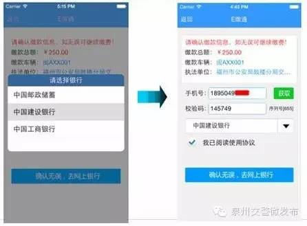 步驟七:網(wǎng)上繳款安全法規(guī)教育答題結(jié)束后,到網(wǎng)上繳款,輸入手機號碼、校驗碼、選擇銀行,點擊“確認無誤,去網(wǎng)上銀行”界面跳轉(zhuǎn)進入網(wǎng)上支付銀行界面
