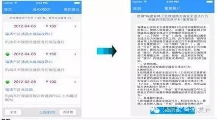 步驟五:網(wǎng)上處理確認違法信息無誤后,點擊違法記錄中的“●”,或點擊手機下方的“全選”按鈕,確定后點擊“去處理”按鈕去處理,進入?yún)f(xié)議界面;