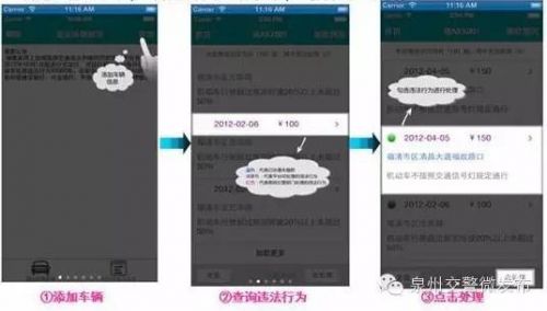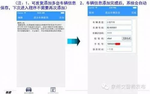 步驟三:實際使用—添加車輛信息進入應用程序后,點擊圖標“添加”,添加所要查詢的車輛信息:輸入車輛類型、車牌號碼、車輛識別碼后四位、校驗碼、手機號、選擇保存時間。