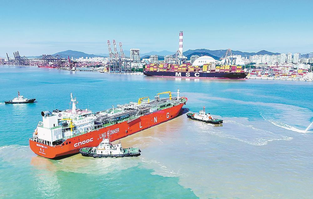 “海洋石油301”輪為靠泊在嵩嶼集裝箱碼頭的“地中海達(dá)莉亞(MSC DARIA)”輪加注保稅LNG燃料。