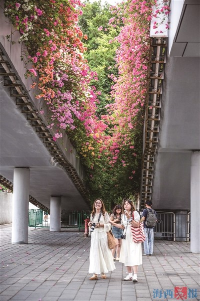 高浦村人行天橋因“三角梅畫(huà)框”意外走紅,吸引不少市民游客前來(lái)打卡。晨報(bào)拍客 陳瑞坤 攝